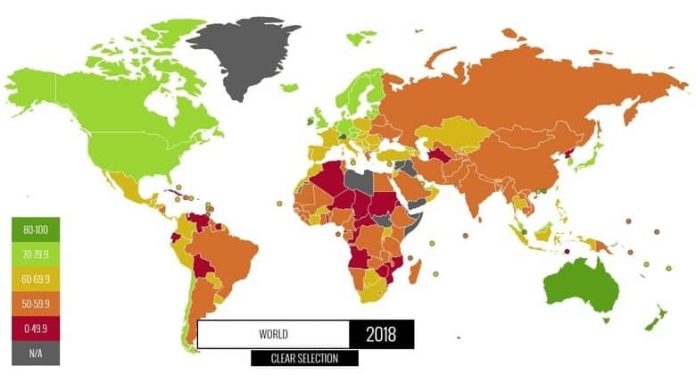 Todos os critérios têm o mesmo peso no cálculo final do índice, que considera uma escala de 0 a 100. Com base nesse resultado, a Heritage divide os países em cinco categorias principais: Livres (acima de 80 pontos), Majoritariamente Livres (de 70 a 79,9 pontos), Moderadamente Livres (de 60 a 69,9 pontos), Majoritariamente Não-Livres (de 50 a 59,9 pontos) e Reprimidos (menos de 49,9 pontos).”