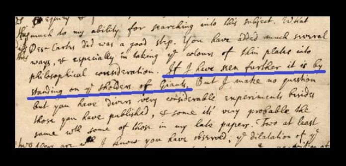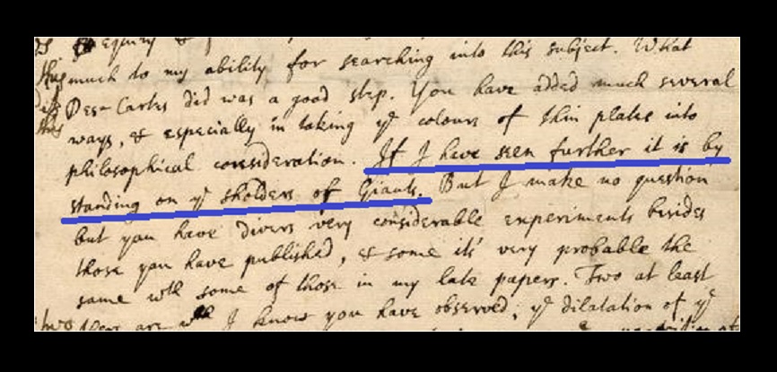 A imagem deste post apresenta um trecho da carta escrita de próprio punho por Isaac Newton e enviada para Robert Hooke em 1675.