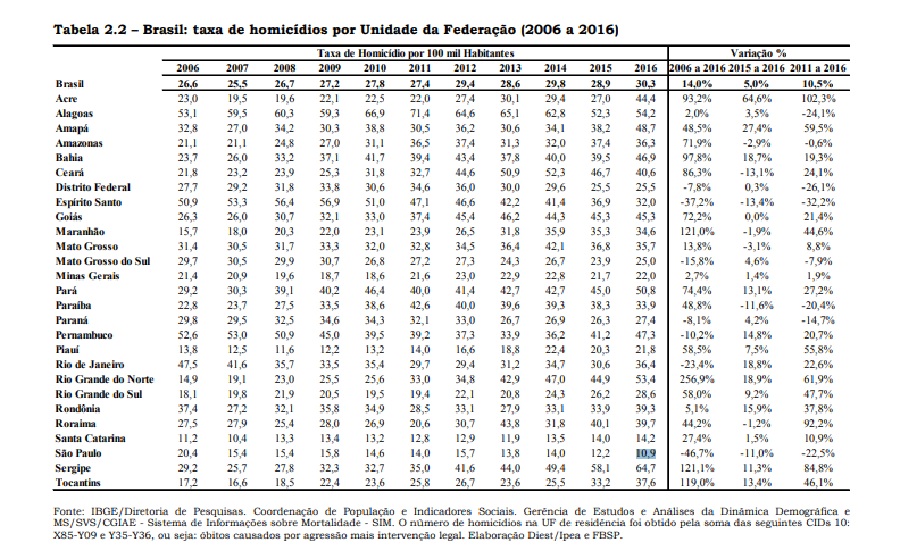Este último item é curioso: segundo dados do IPEA, NENHUMA unidade da Federação apresenta uma taxa anual de homicídios abaixo de 10 / 100 mil habites. A menor taxa, do estado de São Paulo, é de 10.9. Ou seja: TODOS os estados da Federação passam a ser considerados “unidades com elevados índices de violência”.