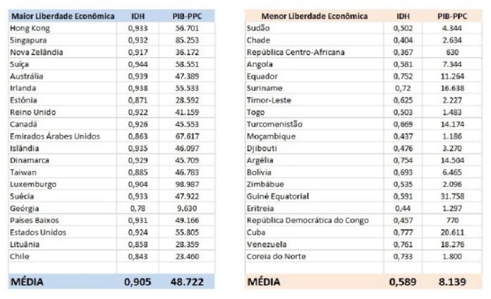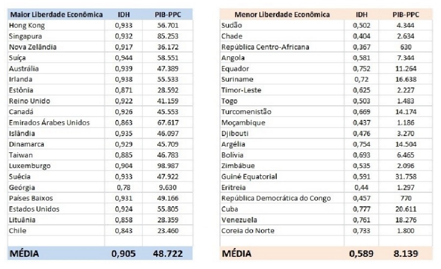 Compilando-se dados da Heritage Foundation, do Banco Mundial e do Fundo Monetário Internacional, observamos que o conjunto dos 20 Países com melhor classificação no índice de Liberdade Econômica (Hong Kong, Singapura, Nova Zelândia, Suíça, Austrália, Irlanda, Estônia, Reino Unido, Canadá, Emirados Árabes Unidos, Islândia, Dinamarca, Taiwan, Luxemburgo, Suécia, Geórgia, Países Baixos, Estados Unidos, Lituânia e Chile) apresenta um PIB em Paridade de Poder de Compra (PIB-PPC) de US$ 48.722 per capta e vivem em um IDH médio de 0,905.